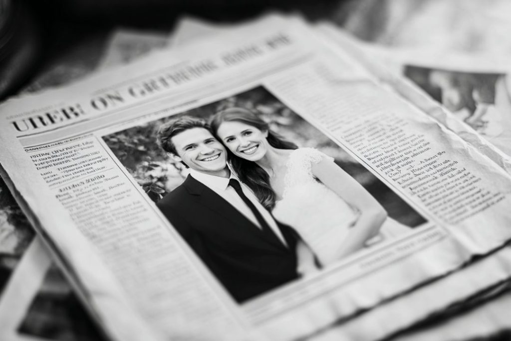 Molte coppie scelgono locandine in stile cinematografico, come se il matrimonio fosse il “film dell’anno”, con tanto di titoli, cast e trama. Altre invece preferiscono il tono giornalistico, con una prima pagina finta che annuncia le nozze come la notizia più attesa del secolo.